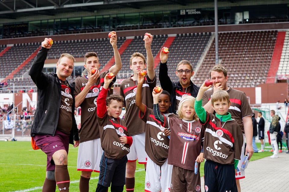 Unsere Clowns trifft man zum Beispiel in den Elbe-Kliniken in Stade, dem Maria-Hilf-Krankenhaus in Harburg, in der Kinder- und Jugendpsychologie in Harburg oder in der Kinderklinik Altona. Die Schuläpfel lassen wir in vier Schulen und Kitas in Hamburg und Niedersachsen verteilen. Auch beim Kiezkick des FC St. Pauli sind wir dabei: Wir unterstützen die Initiative, die ein kostenloses Fußballtraining für Jungen und Mädchen anbietet.